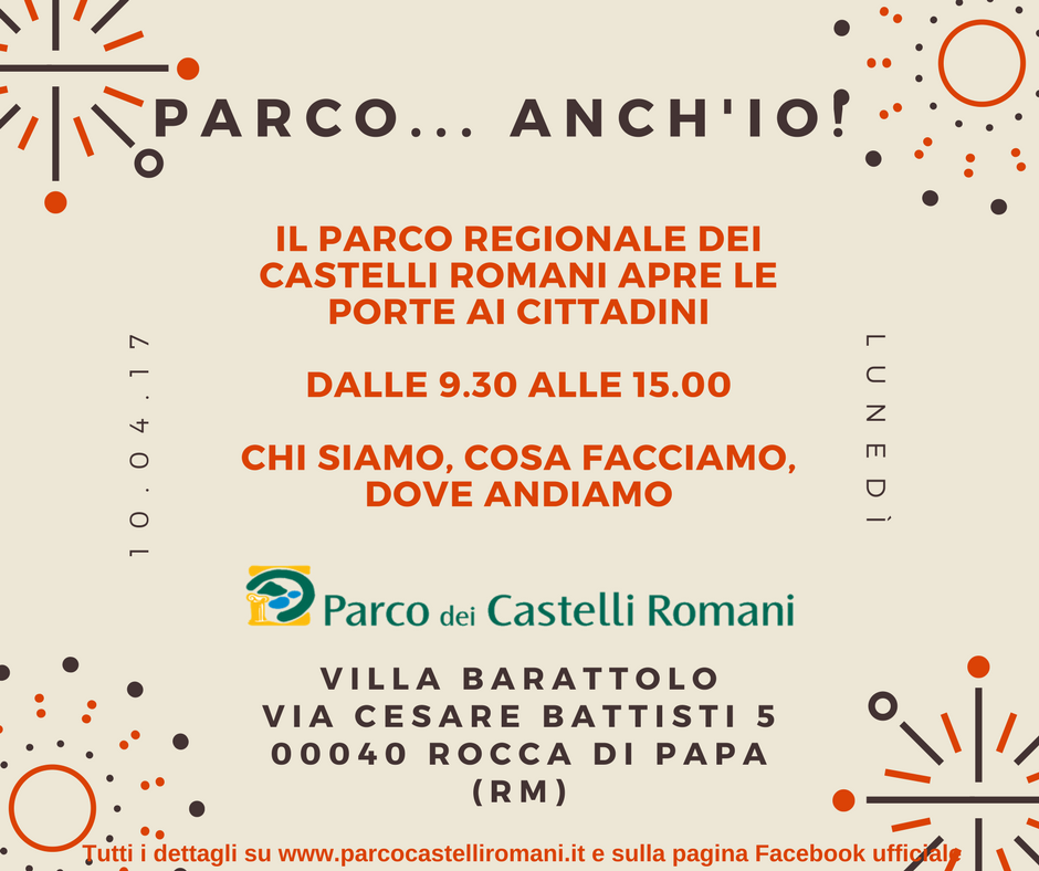 Lunedì 10 aprile dalle 09.30 alle 15.00 a Rocca di Papa, presso la sede del Parco dei Castelli Romani , Villa Bartolo, Via Cesare Battisti 5, si svolgerà "Parco anch'io": una giornata di festa con visite guidate, attività, incontri.
