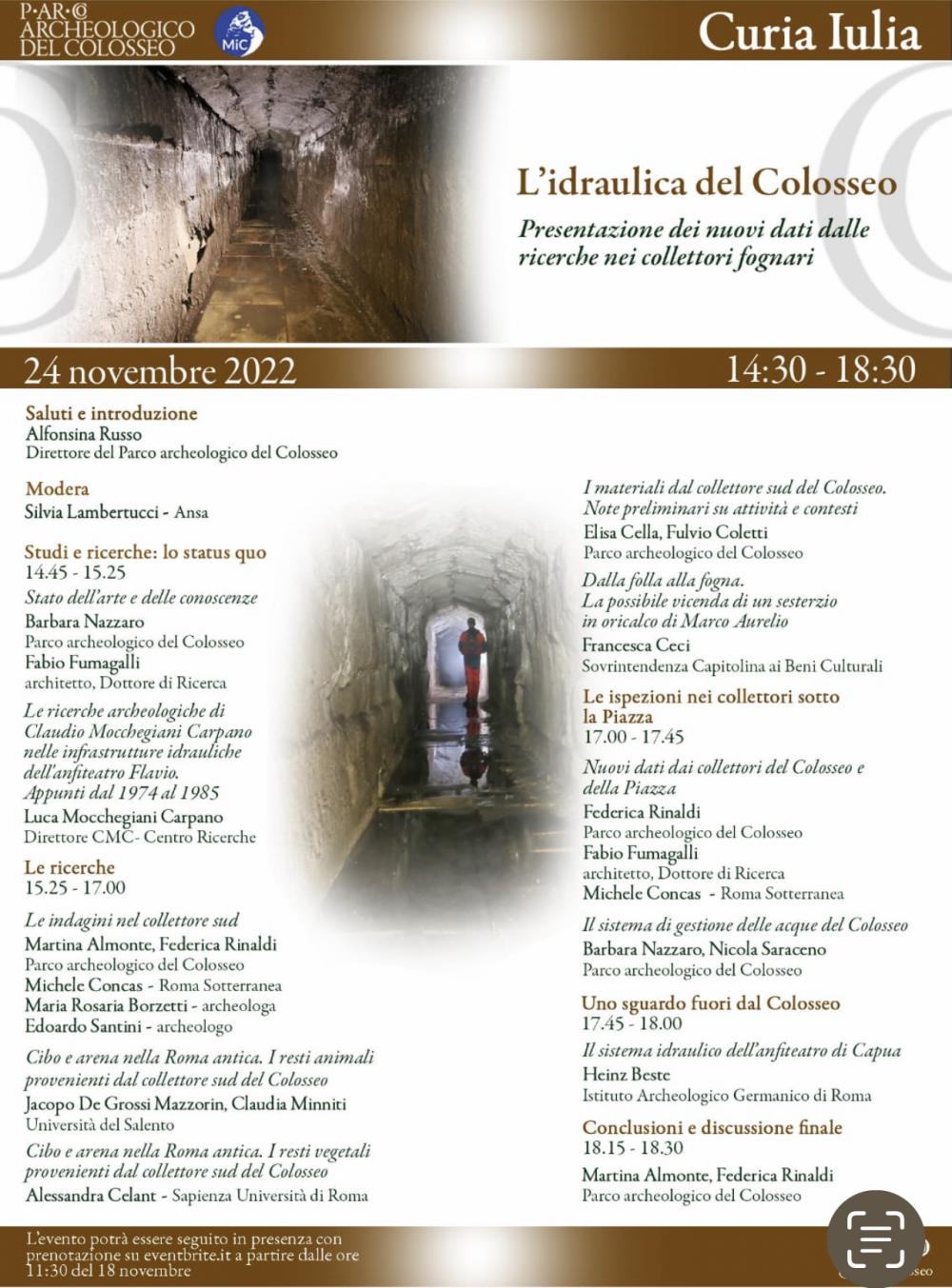 Il 22 Novembre 2022 si è svolto presso la Curia Iulia il convegno dal titolo: "L’idraulica del Colosseo. Presentazione dei nuovi dati dalle ricerche archeologiche nei collettori fognari", in cui sono stati presentati i nuovi dati provenienti dalle recenti ricerche condotte nei collettori fognari del Colosseo grazie alle esplorazioni e ai rilievi effettuati da Roma Sotterranea. I contributi di archeologi, architetti e speleologi saranno presentati corredati da racconti video delle ispezioni e delle attività di ricerca.