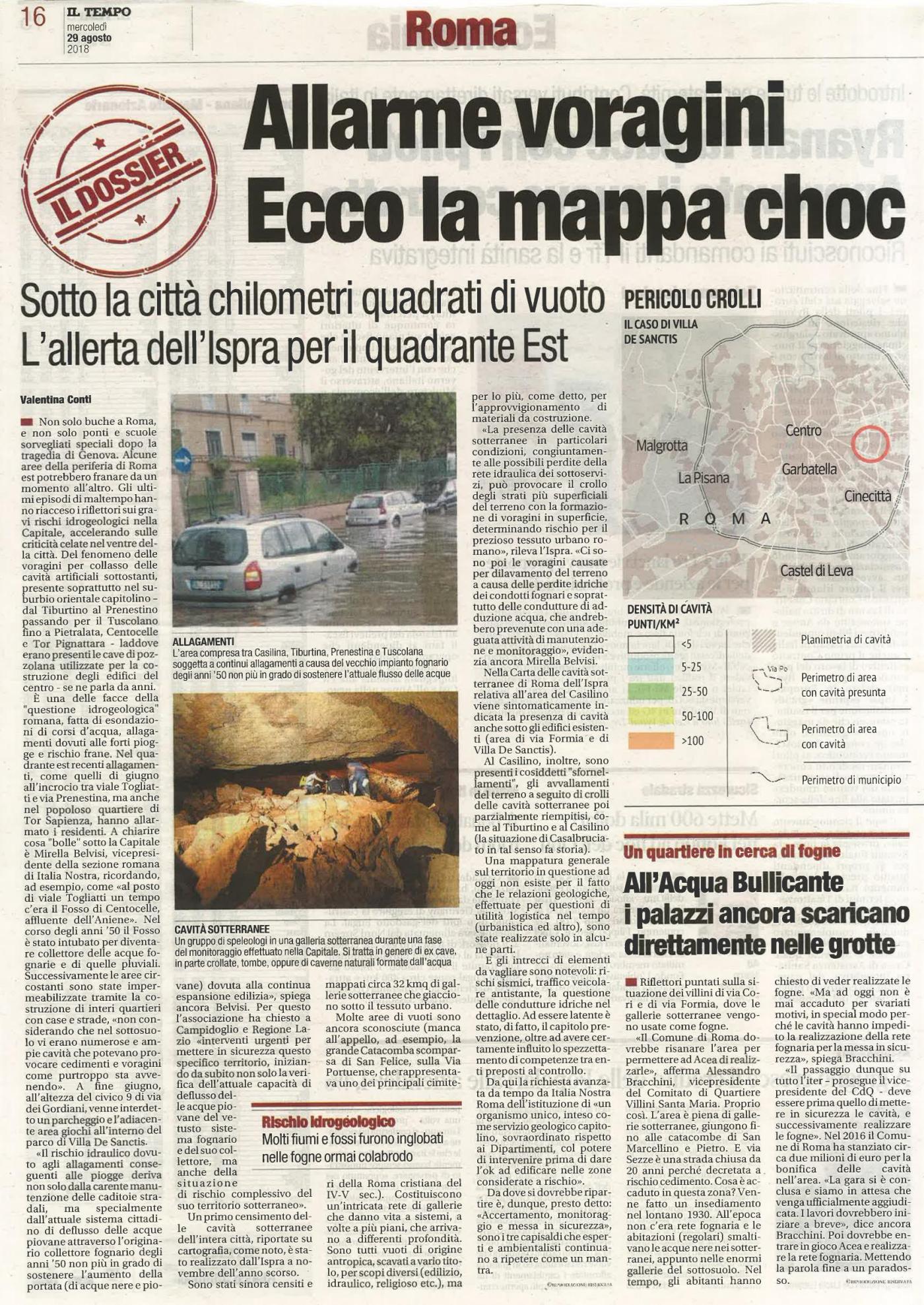 Articolo apparso sulla testata "Il Tempo" che riporta una foto degli speleologi di Roma Sotterranea in azione nel sottosuolo di Via di Tor de Schiavi. Roma Sotterranea non ha fornito contenuti per l'articolo pubblicato, di cui non si condividono i toni allarmistici che mal si sposano con i progetti di intervento in corso.