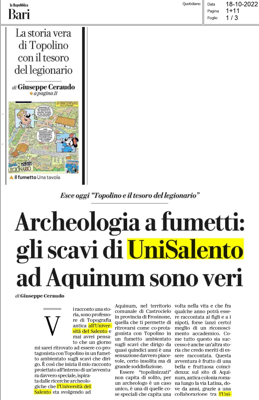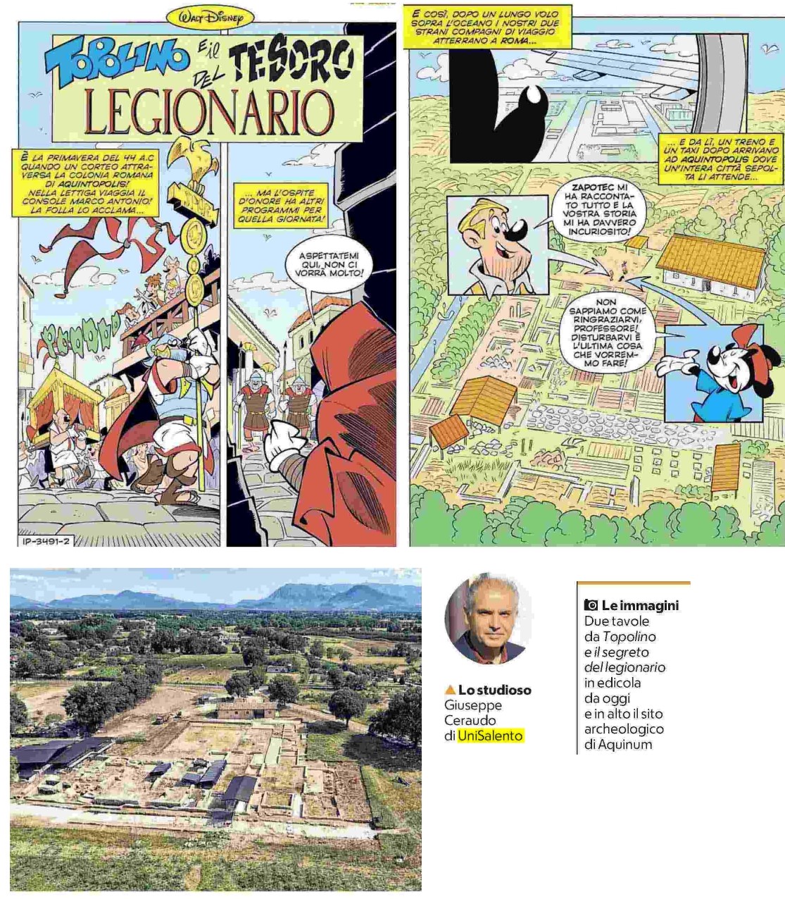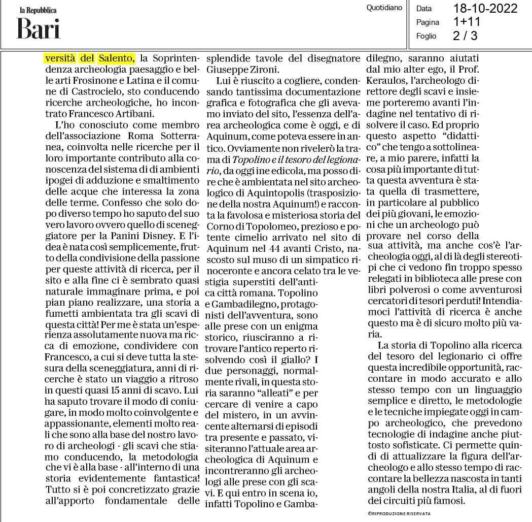 Prendendo spunto da un episodio storico documentato come il passaggio di Marco Antonio ad Aquinum ha preso forma la storia di “Topolino e il tesoro del legionario”, il cui sceneggiatore, Francesco Artibani, è Socio di Roma Sotterranea. Il sito di Aquinum è quello dove la nostra Associazione svolge da diversi anni attività di scavo, rilievo e documentazione.