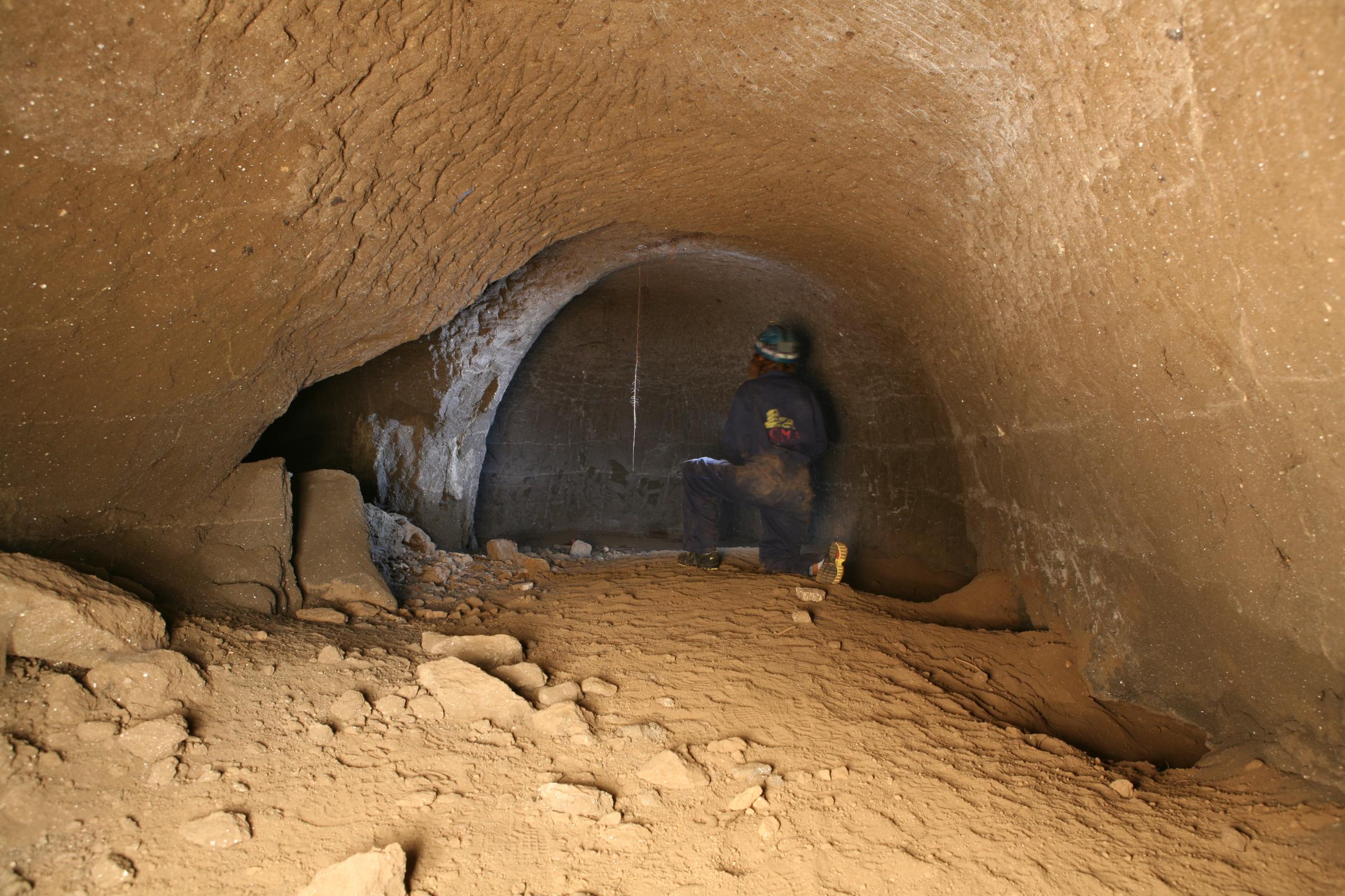 Dall'ingresso si accede ad un ambiente di cava, costituito da un reticolo di cunicoli che si estende per circa 60 metri in direzione NE-SO e per circa 40 metri in direzione NO-SE. L'interno si presenta caratterizzato dallo sviluppo di numerose gallerie riferibili a fronti di estrazione di materiale tufaceo e pozzolanico; nella sua parte centrale lo sviluppo delle gallerie si presenta notevolmente rettilineo. L'altezza media delle gallerie, misurata prevalentemente in corrispondenza degli incroci, è pari a 1,6 metri; l'altezza massima è pari a metri 2,17.