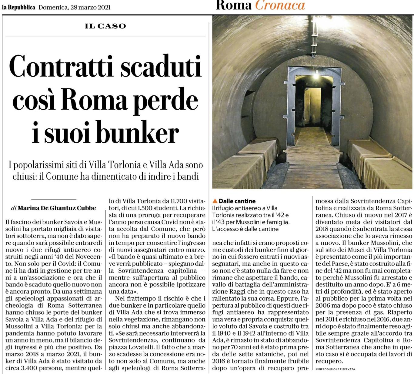 Articolo in cui viene citata l'Associazione Roma Sotterranea relativamente alla scadenza della convenzione per la gestione del Bunker Savoia a Villa Ada e del Bunker Torlonia.