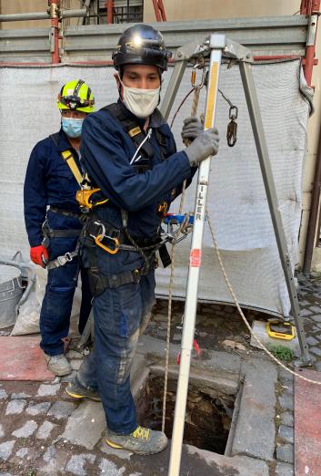 Dopo una breve descrizione di quello che, in base ad alcune planimetrie piuttosto datate mostrate dal geologo responsabile, doveva essere la situazione presente in sotterranea, è stato allestito tutto quanto necessario per la discesa, in primis treppiedi e gli altri DPC del caso. Prima di accedere al pozzo, come da prassi, una volta aperto il tombino di accesso si è proceduto alla verifica della qualità dell'aria con analizzatore multigas.
