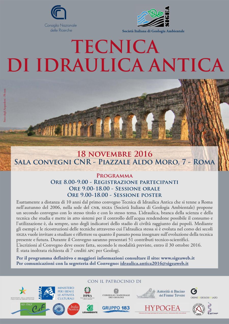 Esattamente a distanza di 10 anni dal primo convegno Tecnica di Idraulica Antica che si tenne a Roma nell'autunno del 2006, nella sede del cnr, SIGEA (Società Italiana di Geologia Ambientale) propone un secondo convegno con lo stesso titolo e con lo stesso tema. L'idraulica, branca della scienza e della tecnica che studia e mette in atto sistemi per il controllo dell'acqua rendendone possibile il consumo e l'utilizzazione è, da sempre, uno degli indicatori dello stadio di civiltà raggiunto dai popoli. Mediante gli esempi e le ricostruzioni delle tecniche attraverso cui l'idraulica stessa si è evoluta nel corso dei secoli sigea vuole invitare a studiare e riflettere su quanto il passato possa insegnare sull'evoluzione della tecnica presente e futura.