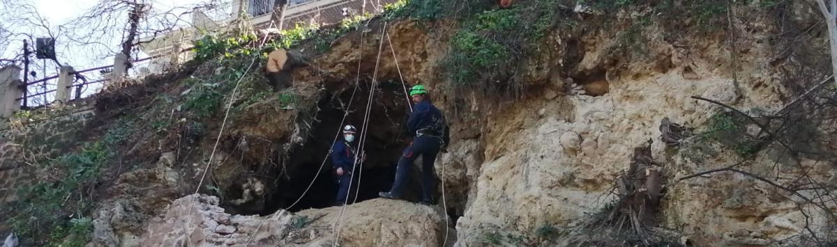 Attrezzati con imbrago e doppia fune, gli speleologi di Roma Sotterranea si sono calati lungo il costone tra Via Archimede e Via Maresciallo Pilsudsky in quella che molte testate giornalistiche hanno definito erroneamente una "grotta".
