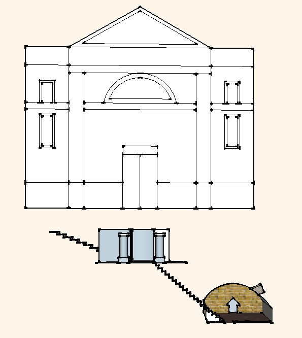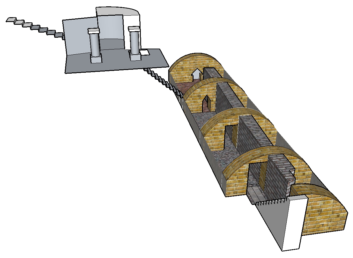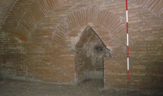 Per accedere a tali ambienti, una volta scesi nella cripta posta al di sotto del pavimento del presbiterio della chiesa, bisogna aprire una botola per raggiungere il sottostante livello posto a circa 3,70 m più in basso. Ci si trova quindi in un ambiente voltato alto 3,50 m, largo 4,70 m circa e lungo in totale quasi 19 m. L'ambiente risulta oggi stravolto e in gran parte occupato da alcune strutture di fondazione perpendicolari ad esso, realizzate al momento della costruzione del sovrastante edificio di culto.