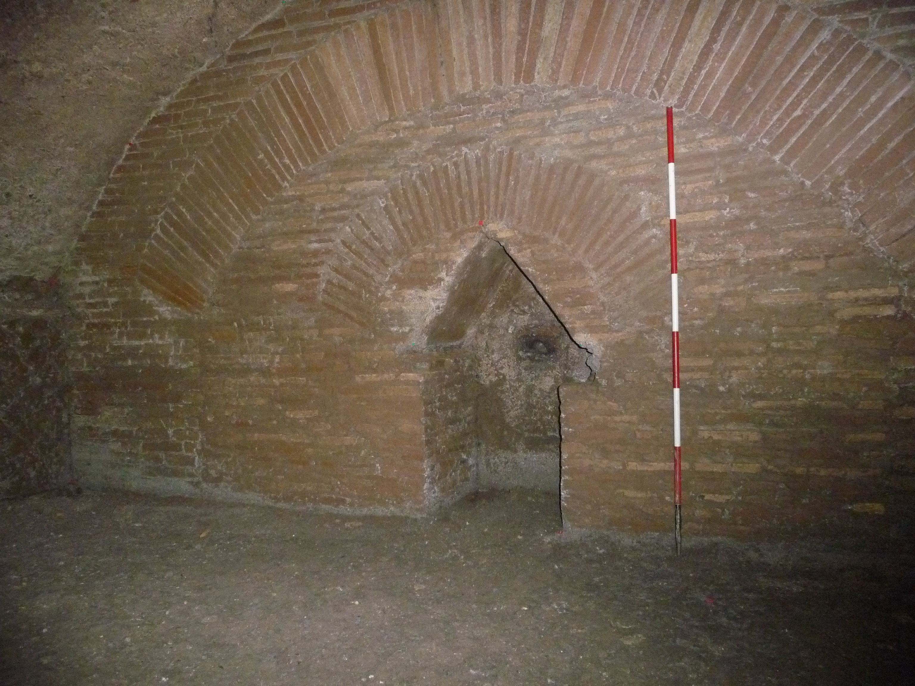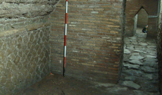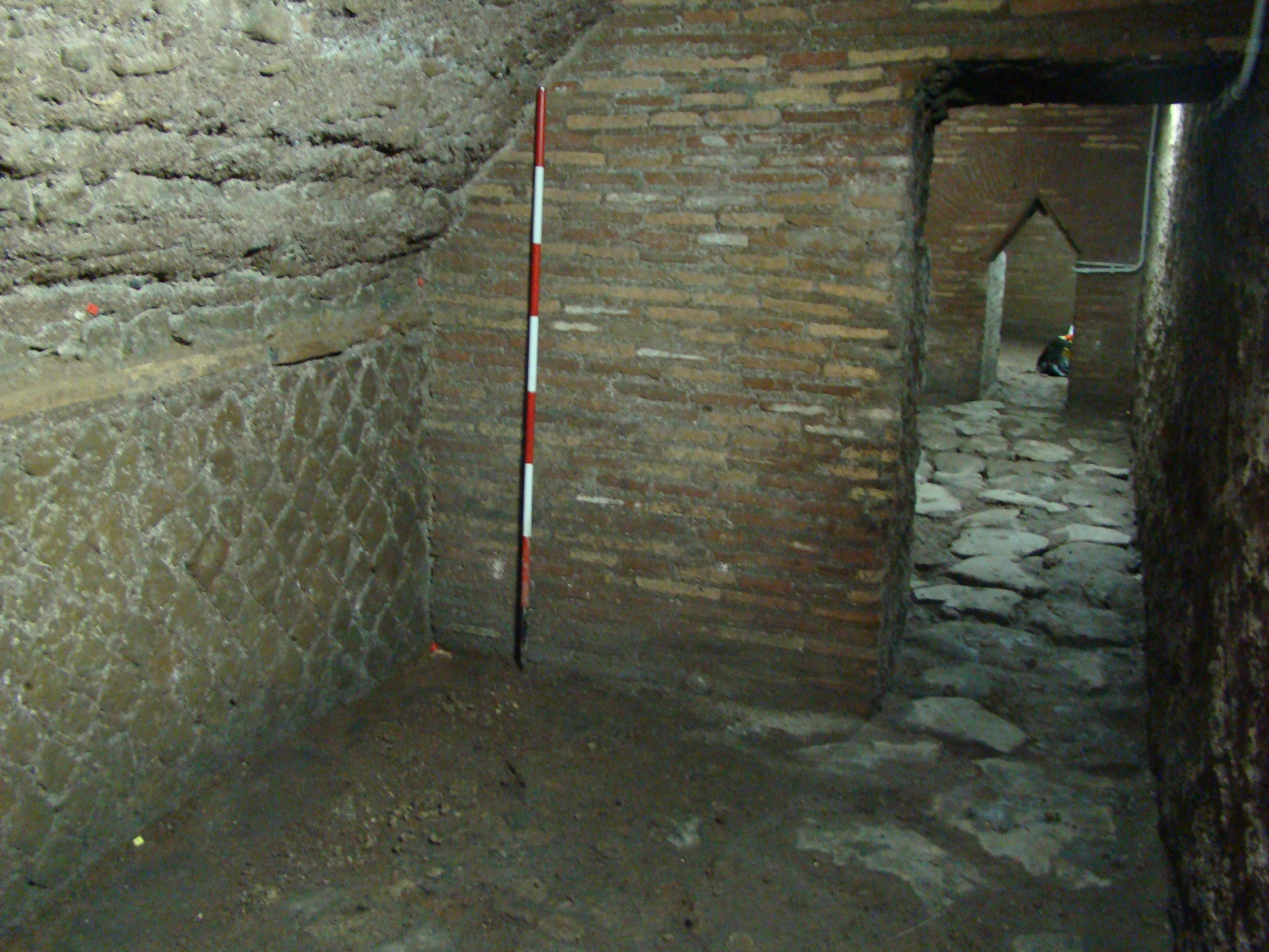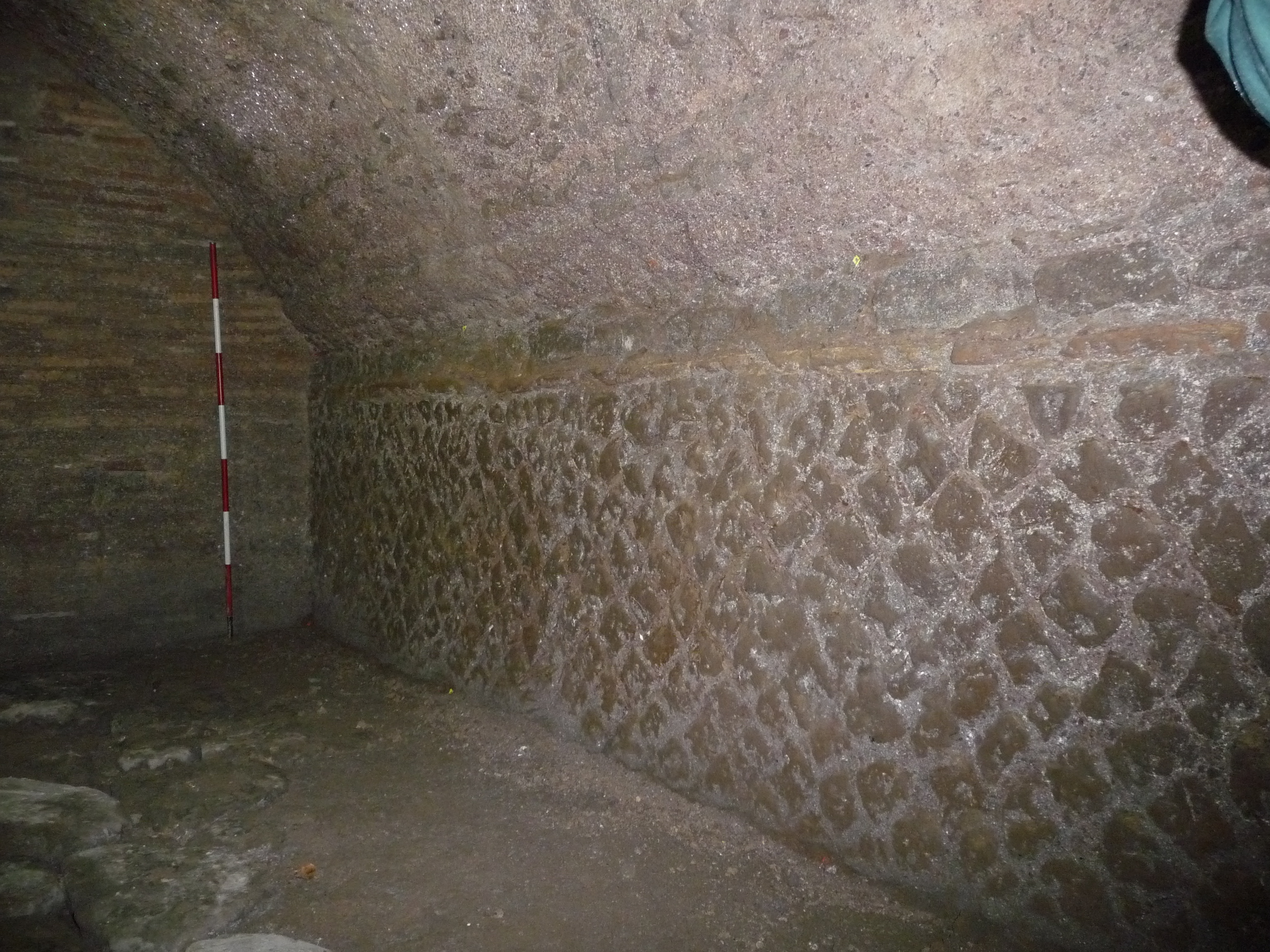 L'intervento dell'Associazione è stato diviso in tre distinte fasi: inizialmente ci si è dedicati alla valutazione dello stato di alterazione superficiale delle murature laterizie e tufacee. La superficie delle murature risultava alterata dalla deposizione di uno strato di materiale fangoso di natura argillosa uniformemente distribuito e facilmente removibile mediante spazzolatura. La presenza di un alto grado di umidità, trasudante dalle murature, ha portato a preferire l'utilizzo di spazzole di nylon rispetto a quelle in acciaio per evitare di alterare la superficie, in particolare dei cubilia in tufo di opera reticolata resi particolarmente friabili dall'imbibizione. Le attività svolte sono stato oggetto di accurata documentazione fotografica al fine di valutare lo stato preliminare e quello successivo all'intervento di spazzolatura delle pareti.