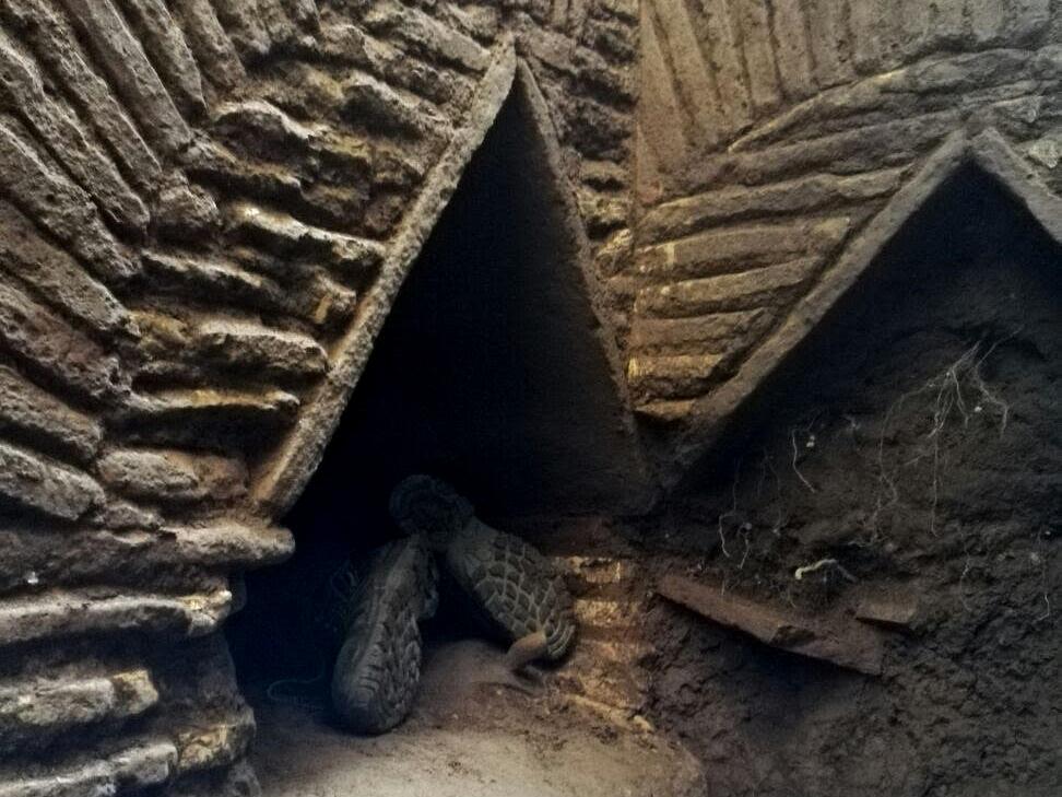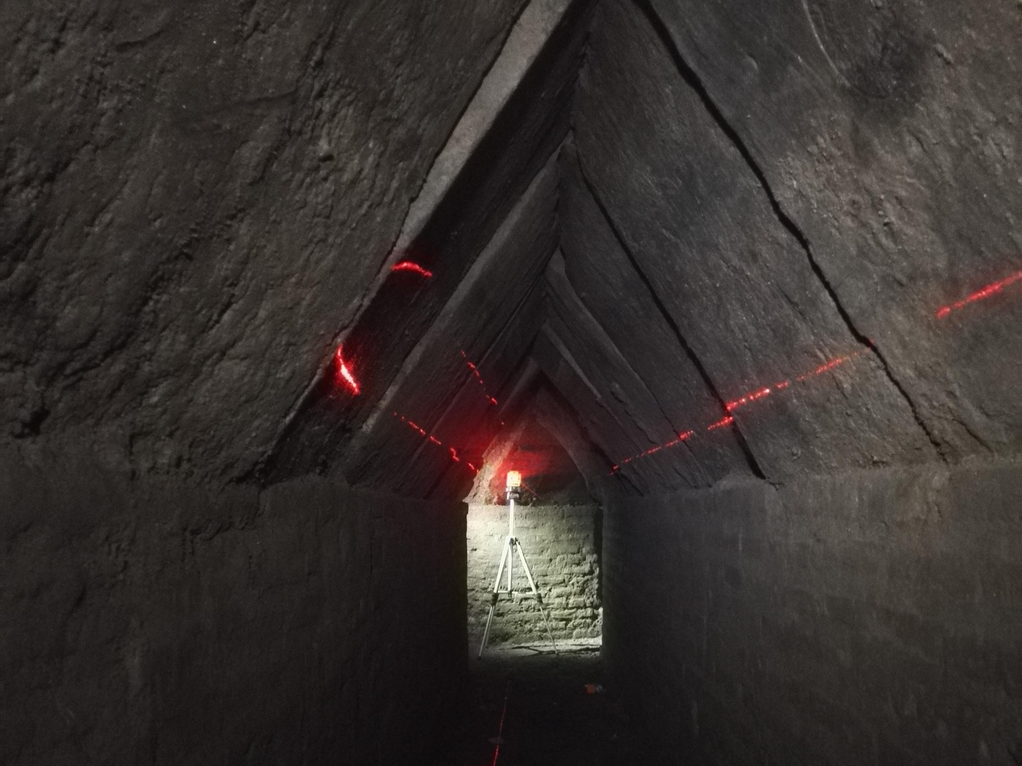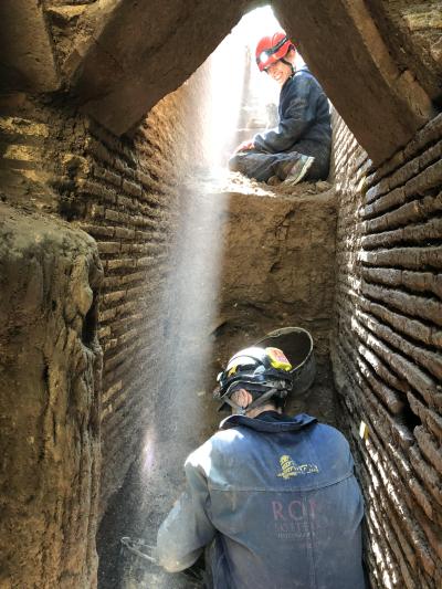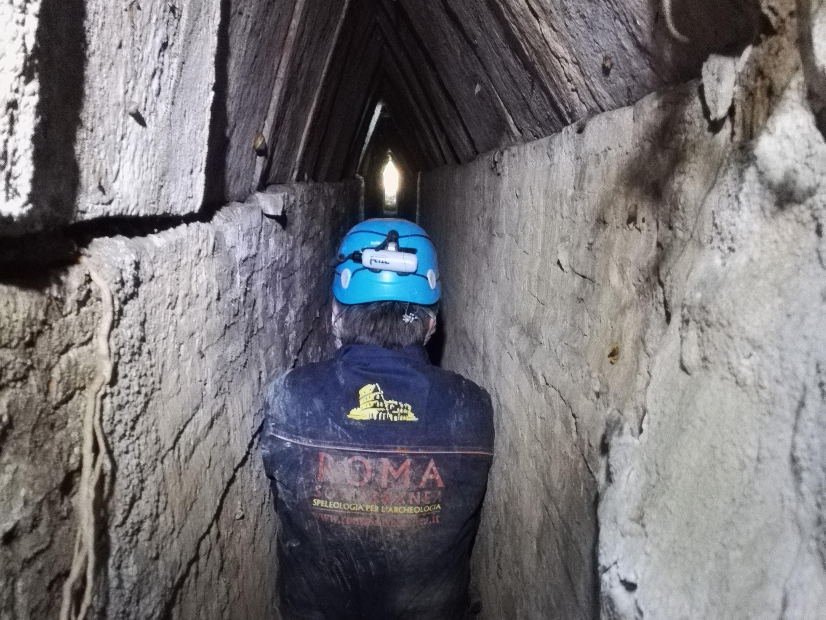 Attraverso una video ispezione con telecamera e asta telescopica è stato possibile verificare che il condotto si sviluppa per circa 6 metri in direzione est prima di essere interrotto da quello che sembrerebbe un crollo. La struttura, per la parte a vista, si presenta in buone condizioni, ma il crollo del piano sovrastante, avvenuto probabilmente in seguito al crollo delle volte e di conseguenza di porzioni delle pareti laterali, ha compromesso la stabilità di alcune porzioni della copertura in bipedali.
