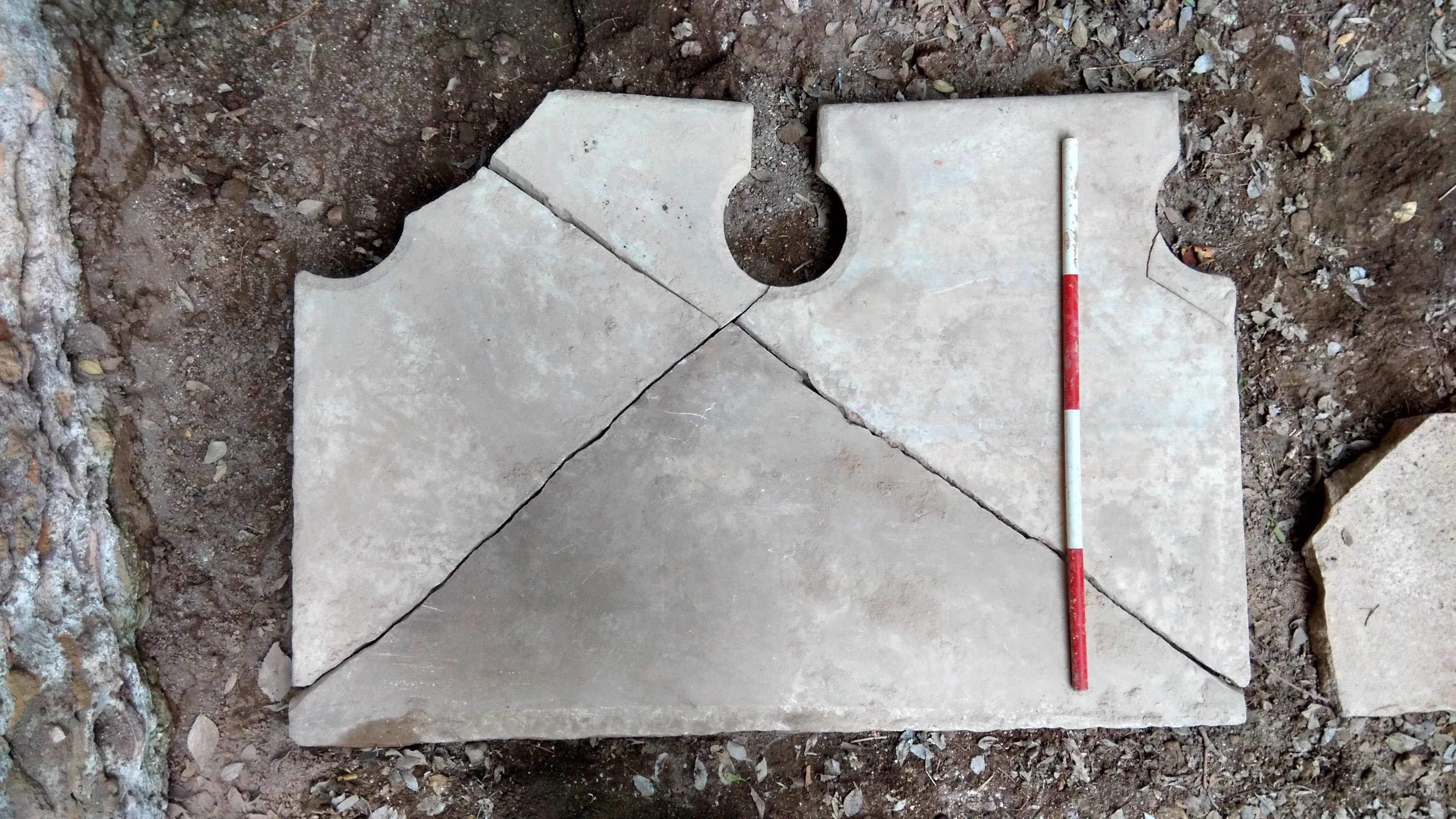 Durante lo scavo sono state rinvenute due sedute (sellae pertusae) in marmo proconnesio di notevoli dimensioni con un peso di oltre 200 kg e le relative lastre verticali di sostegno sempre nello stesso marmo. Delle due sellae rinvenute, una è quasi del tutto intatta, mentre sia la seconda che le lastre verticali sono frammentate in ampie porzioni. Fortunatamente, ad eccezione di alcune piccole parti è stato comunque possibile ricostruirle quasi per intero.