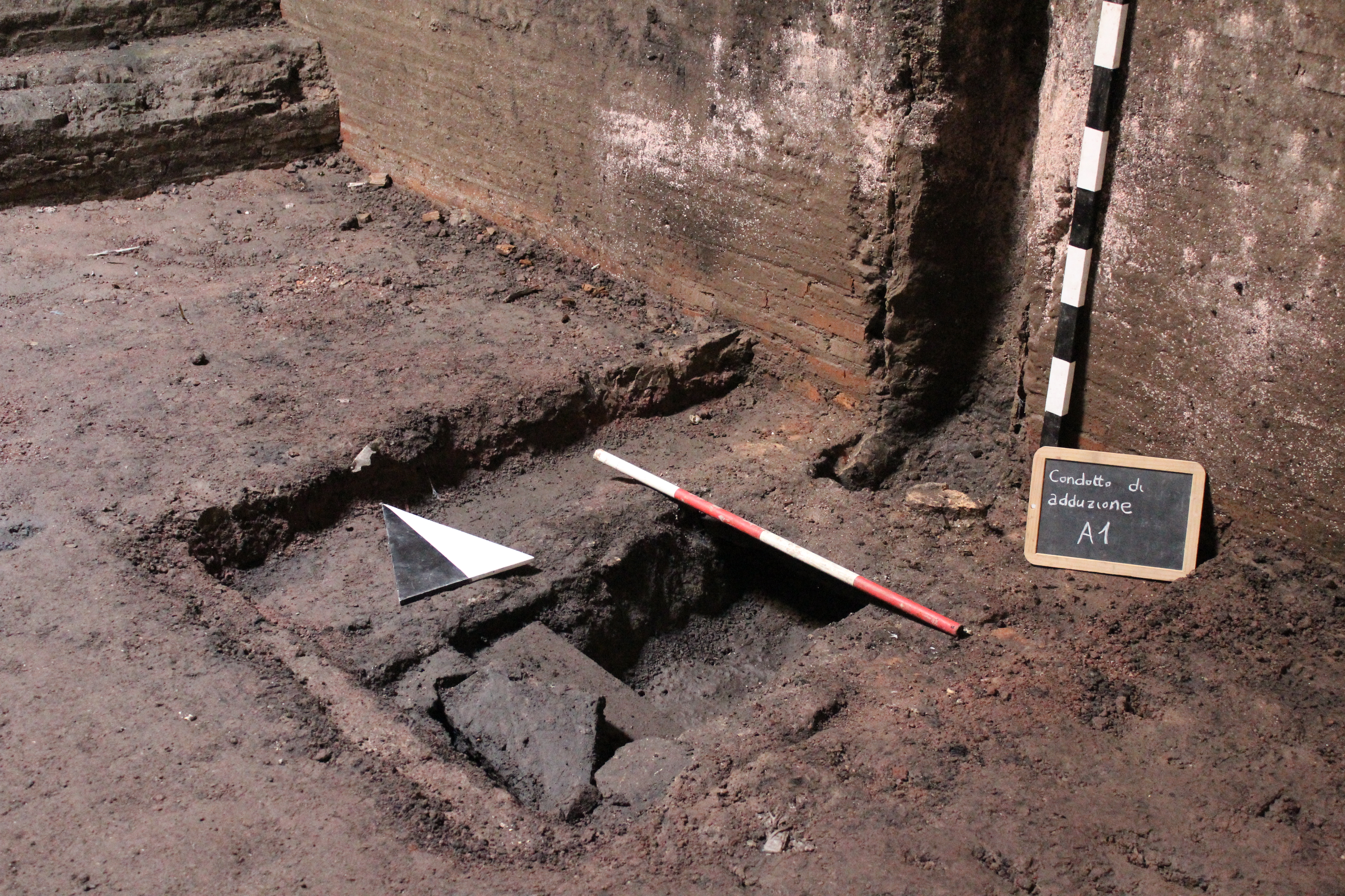 Valutando la dimensione, la posizione e la presenza di spessi strati di calcare, si può ipotizzare che il condotto fosse utilizzato come scolo di una delle vasche che molto probabilmente si trovavano nell'area dell'emiciclo antistante le latrine o come ulteriore adduzione di acqua per la pulizia e il risciacquo del canale. Date le dimensioni di queste strutture e l'elevato numero di utilizzatori della struttura, riteniamo vadano prese in considerazione entrambe le ipotesi.